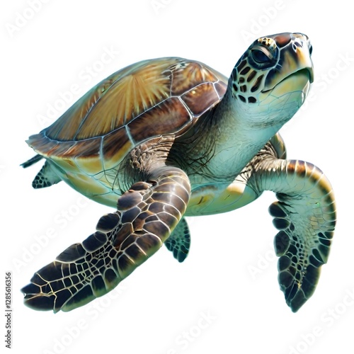 A close-up of a green sea turtle swimming underwater, showing its detailed shell and flippers