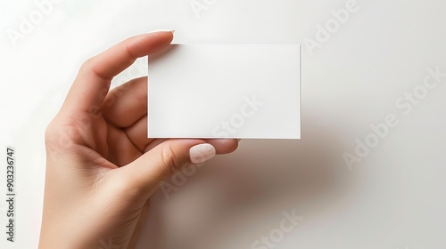 A close-up of a hand holding a blank white business card against a soft white background, ideal for customization and branding needs.