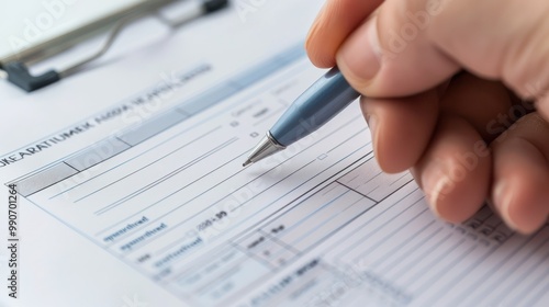 A close-up of a hand holding a pen and filling out an appointment booking form