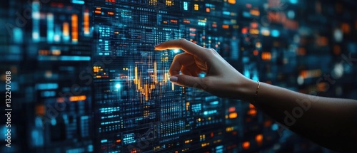 A close-up of a hand interacting with a digital financial display, showcasing data analysis trends