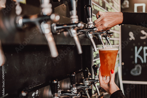 A close-up of a hand pouring beer from a tap into a clear pint glass, with multiple taps and a chalkboard menu in the background. The scene captures the essence of a craft beer bar.