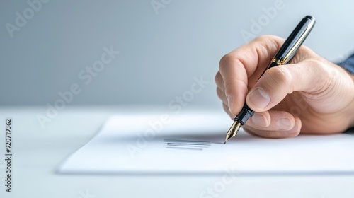A close-up of a hand writing with a fountain pen, with ink flowing onto the paper