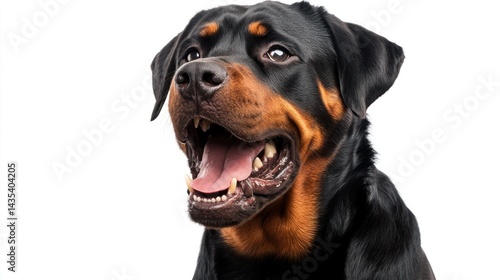 A close-up of a happy Rottweiler dog with an open mouth and expressive eyes.