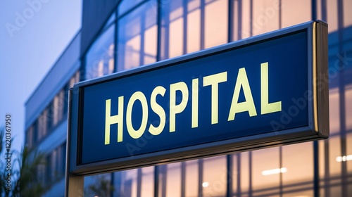 A close-up of a hospital sign with the building in the background, illuminated by soft lighting to highlight the facility's role in offering medical care and services.