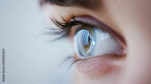A close-up of a human eye showcases intricate details and reflections, emphasizing technology and light. The eye captures digital imagery, representing a blend of biology and modern innovation.