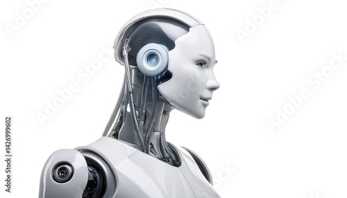 a close-up of a humanoid robot's head and neck, highlighting the intricate details of its mechanical design. The robot has a sleek, white exterior and appears to be female.