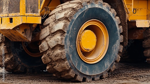 A close-up of a large, muddy tire on a yellow construction vehicle. The tire is covered in dirt and has a deep tread.