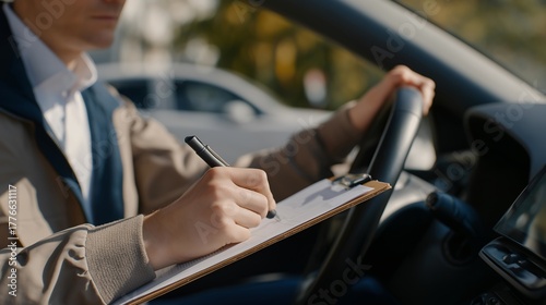 A close-up of a learner’s hands on the steering wheel with an instructor’s clipboard visible, symbolizing focus, evaluation, and real-time driving assessment. cinematic color correction, gentle