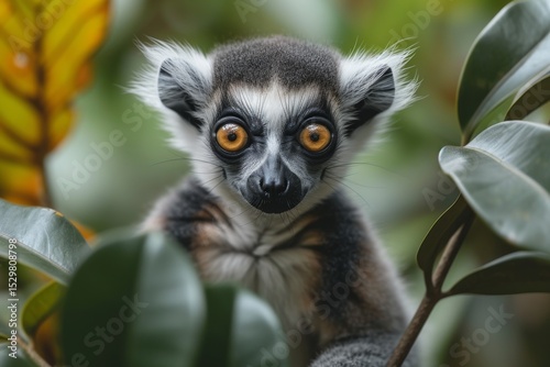 A close-up of a lemur sporting large, expressive eyes peering from amidst lush green foliage, illustrating the wonder and unique beauty of wildlife in its natural habitat.