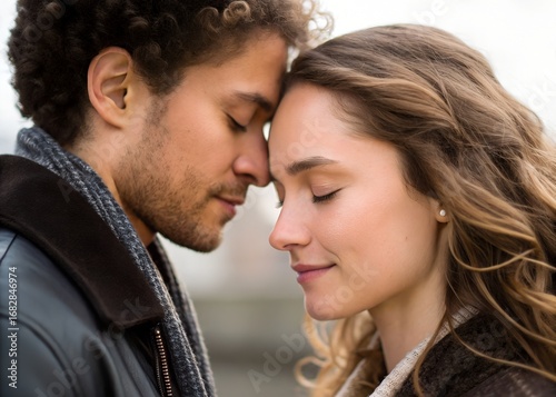 A close-up of a man and woman with their faces gently touching and eyes closed