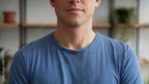 A close-up of a man wearing a blue t-shirt