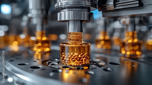 A close-up of a manufacturing process, showcasing amber liquid in a bottle on an industrial assembly line.