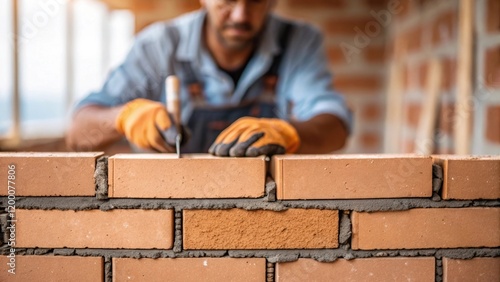A closeup of a masonry worker applying mortar to bricks showing the hands at work with tools and partially finished walls in the blurred background.