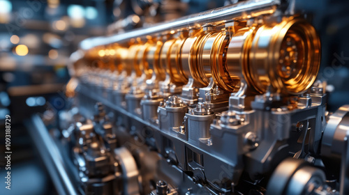 A close-up of a mechanical engine component featuring shiny gold and silver elements, showcasing intricate design and engineering.