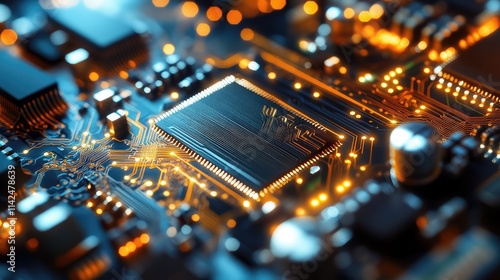 A close-up of a microchip under a microscope with a focus on its illuminated pathways and minuscule transistors