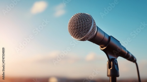 A close-up of a microphone against a clear blue sky, symbolizing communication and performance.