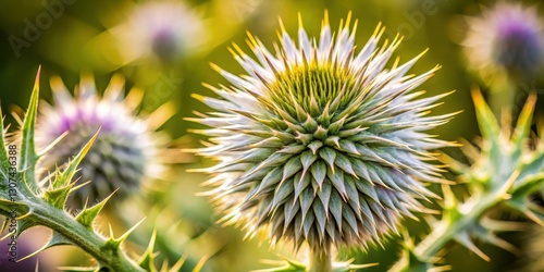 A close-up of a milk thistle plant's unique seed pods in selective focus, showcasing intricate details and texture