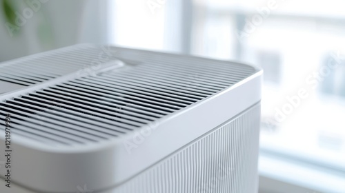 A close-up of a modern air purifier with HEPA filter on a white background