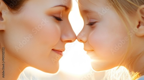 A close-up of a mother and daughter gently touching noses, both smiling in a warm and soft light, expressing love and connection.