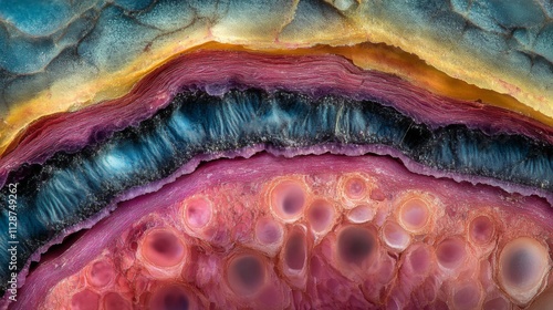 A Close-up of a Multi-Layered Agate Stone with Blue, Purple, and Orange Hues
