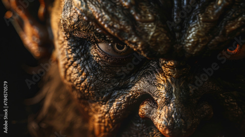 A close-up of a mystical creature with a textured face, showcasing intense eyes that gleam in the shadowy ambiance.