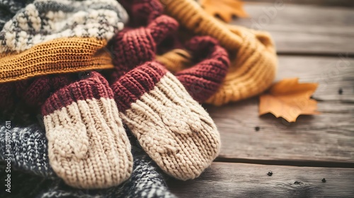 A close-up of a pair of knitted mittens resting on a wooden table, surrounded by a cozy scarf and winter hat
