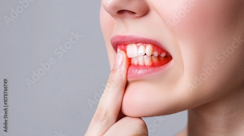 A close-up of a person showing discomfort while pointing at their gums, possibly indicating dental pain or irritation.