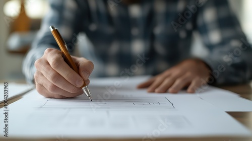 A close-up of a person writing on a blueprint with a pen, showcasing detailed planning and creative process in design work.