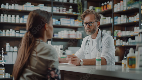 A close-up of a pharmacist handing a customer their prescription across the counter, pharmacist and customer, hd, with copy space