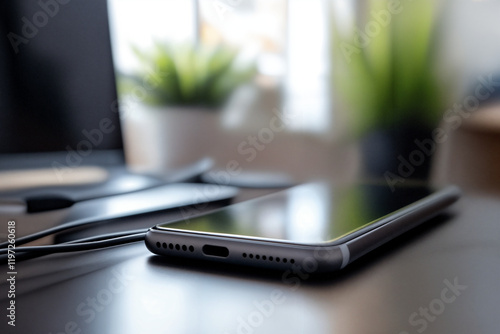 A close-up of a phone on a charger, lying on a table next to a computer, against the blurred background of the room