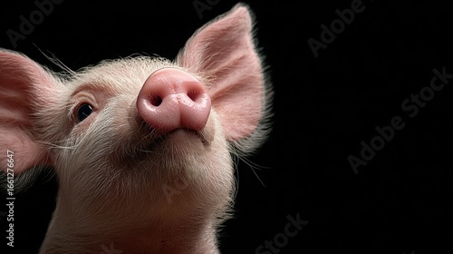 A close-up of a piglet, head tilted upwards, with pink snout and ears against a stark black backdrop