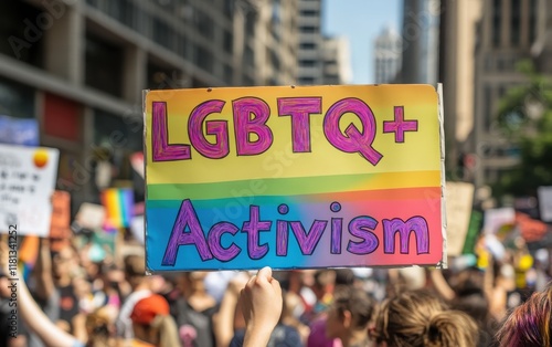 A close-up of a protest sign with the words "LGBTQ+ Activism" written in bold rainbow colors, held by a hand in front of a crowd.