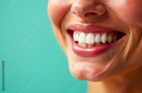 A close-up of a radiant smile with perfect white teeth, set against a calming teal background. The smile exudes warmth and confidence, highlighting the importance of dental health and personal care.