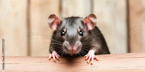 A close-up of a rat with large ears and bright eyes, perched on a wooden surface against a blurred background. Concept Close-Up Photography, Rat Characteristics, Animal Portraits, Nature Backgrounds