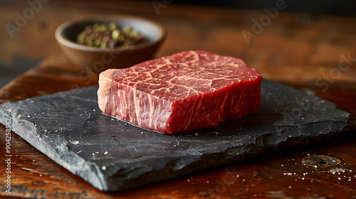 A close-up of a raw marbled beef steak placed on a slate board, ready for preparation, with a bowl of spices in the background