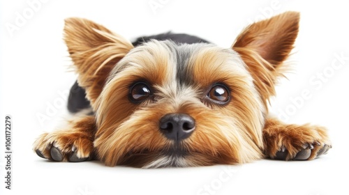 A close-up of a relaxed dog resting its head on the ground.