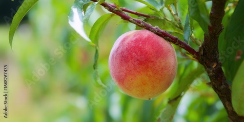 A close-up of a ripe peach on a tree branch, ready for picking in the summer.