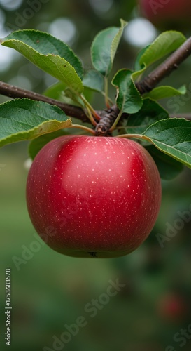 A close-up of a ripe red apple hanging from a branch with fresh green leaves, showcasing natural color, texture, and orchard freshness for use in food, agricultural, or seasonal design visuals