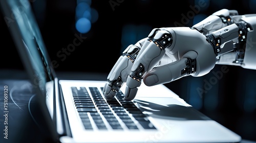 A close-up of a robotic hand typing on a laptop keyboard.