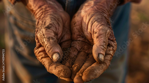 A close-up of a senior farmer's hands, weathered from work, holding a handful of fertile soil, symbolizing decades of toil and care, Senior farmer, blurred background, with copy space
