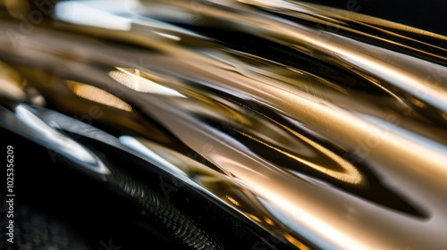 A close-up of a shiny, reflective metallic surface with smooth curves and highlights.