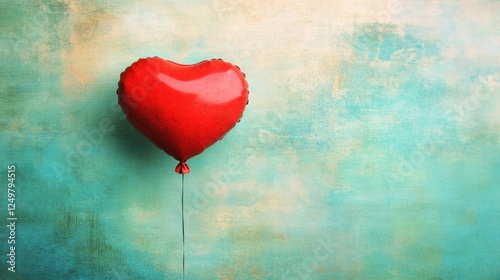 A close-up of a single red heart balloon floating on a soft pastel background.