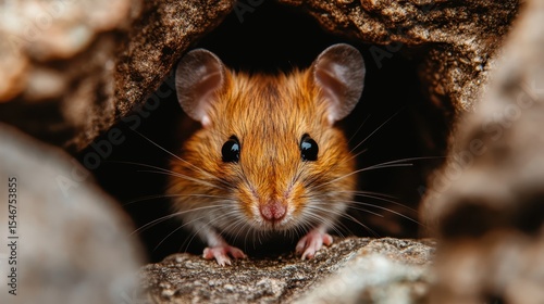 A close-up of a small brown mouse peering from its rocky hideout, capturing the essence of wildlife curiosity and the beautiful textures of its natural habitat.