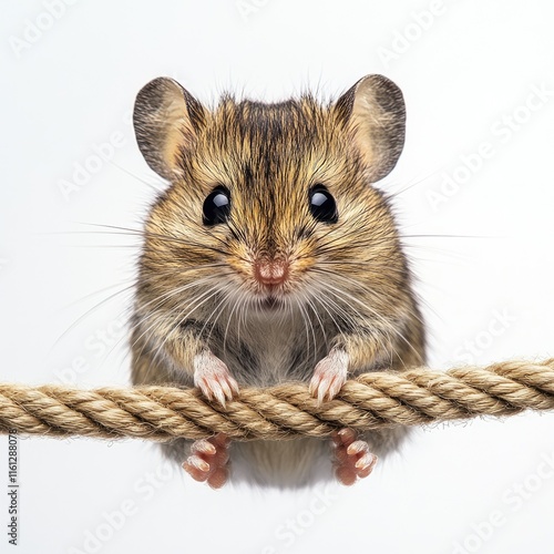 A close-up of a small, furry mouse perched on a rope against a plain background.
