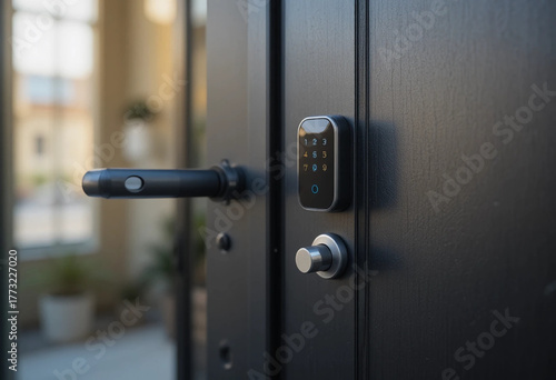 A close-up of a smart door lock on a modern black metal door. The smart lock on a black metal door adds a touch of security to urban living.