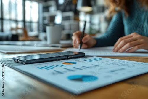 A Close-up of a Smartphone and Financial Charts on a Wooden Desk