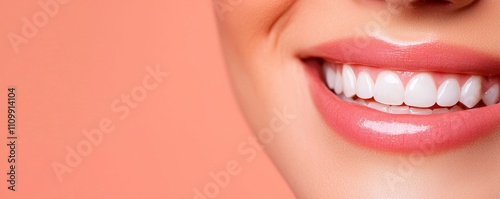 A close-up of a smiling mouth showcasing bright white teeth and soft, pink lips against a coral background.