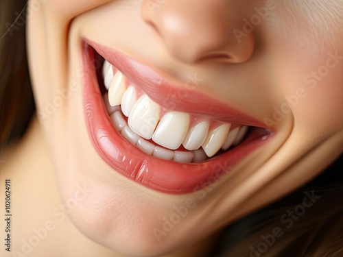 A close-up of a smiling person with white, healthy teeth. The teeth look clean and bright, emphasizing good dental hygiene and health.