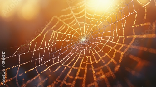A close-up of a spider web glistening in soft sunlight.