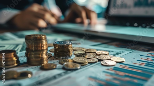 A close-up of a stack of coins on a table with a blurred background of a person working on a laptop.
